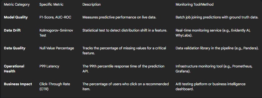 Data Quality Metrics: This layer monitors the health of the input data itself. It tracks for issues like an increase in null values, schema changes (e.g., a feature is no longer being sent), or values falling outside expected ranges. Poor data quality is often a leading indicator of downstream model problems.