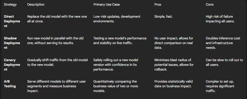 Canary Deployment (Gradual Rollouts): The new model is initially released to a small subset of users (e.g., 5% of traffic). Its performance is monitored closely for key metrics like error rates and business impact. If it performs as expected, traffic is gradually shifted from the old model to the new one until the rollout is complete.