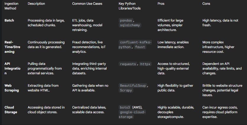 Batch Ingestion: This method involves processing data in large, scheduled blocks. It is ideal for analytics and model training scenarios where real-time updates are not necessary and latency is not a primary concern. Data can be ingested from files or databases.